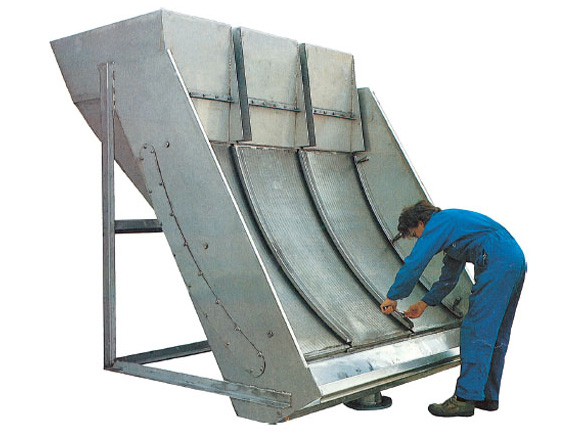 獨(dú)特的篩板是由楔形棍條形成的弧形表面構(gòu)成,棍條之間有水平的縫隙,通常縫寬350 微米。要被篩選的液流通過進(jìn)漿箱進(jìn)入,靠重力通過一個堰嘴流向篩板,當(dāng)懸浮液沿著篩板流動時,薄層水被篩板棍條切離,并隨著細(xì)小顆粒一起通過篩縫。